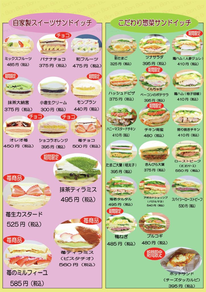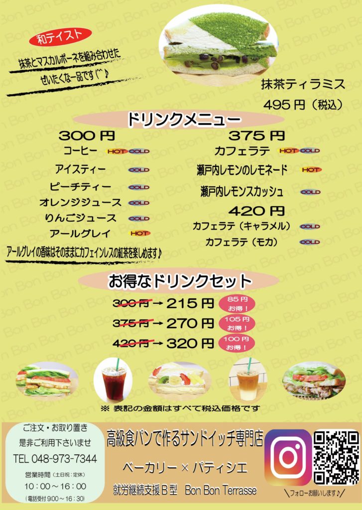 こだわりの高級食パンで作ってます 店内風景 テラス席風景 お知らせ Bon Bon Terrasse2026.03.03 3月の注文表を出張販売ページへ掲載いたしました。 Bon Bon Terrasse2026.03.02 3月の新商品・メニューを掲載いたしました Bon Bon Terrasse2026.01.31 2月の新商品・メニューを掲載いたしました Bon Bon Terrasse2026.01.111月の新商品・メニューを掲載いたしました Bon Bon Terrasse 今月のおすすめサンドイッチ 鶏ハム(人参ジュレ) 税込 410 円 たまご大葉(明太子) 税込 395 円 抹茶ティラミス 税込 495 円 モンブラン 税込 440 円 抹茶大納言 税込 375 円 チキン南蛮 税込 480 円 bon_bon_terrasse Bon Bon Terrasse Instagram ☆今週限定ホットサンド☆ クロックムッシュ¥395(税込) 今日も10時~16時まで営業中。 テイク 苺ティラミス(ピスタチオ) 近隣の苺農園(越谷)より仕入れた 大粒の苺にピスタチオクリーム マスカル ☆鴨ねぎ☆ 本日も10時~16時まで営業中。 テイクアウト・イートイン利用可能です(^^)/ ご来店 ★1月の新商品★ 苺ティラミス(ピスタチオクリーム) ¥560 本日も10時~16時まで通常営業。 ☆1月のメニュー表☆ 本日より営業スタート(#^.^#) 10時~16時まで通常営業。 テイクアウト ☆苺チョコ☆ ¥500(税込) 近隣の苺農園より仕入れた 大粒の苺を使用しています♪ 本日も10時~ さらに読み込む... Instagram でフォロー 営業日カレンダー